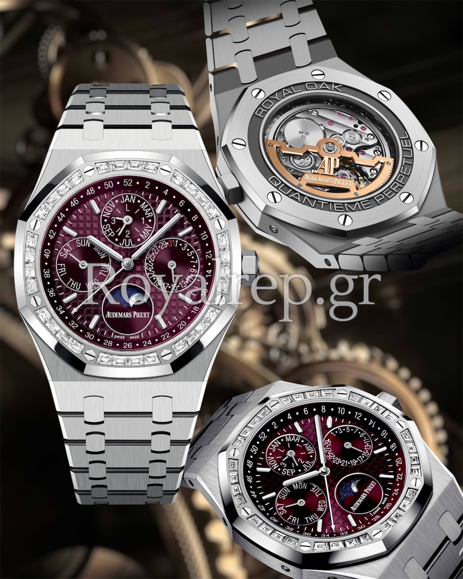 Το Audemars Piguet Royal Oak Perpetual Calendar 26598BC Purple Dial είναι μια εντυπωσιακή και σπάνια ρέπλικα, σχεδιασμένη για όσους αγαπούν τη λάμψη, το χρώμα και την τεχνική πολυπλοκότητα. Με κάσα 41mm από ανοξείδοτο ατσάλι 904L και bezel διακοσμημένο με λαμπερούς κρυστάλλους, το ρολόι αποπνέει πολυτέλεια και φινέτσα.Το μοβ καντράν “Grande Tapisserie” δίνει χαρακτήρα και βάθος, ενώ φιλοξενεί ενδείξεις Perpetual Calendar: ημέρα, ημερομηνία, μήνας, δίσεκτο έτος και φάσεις σελήνης – όλα τοποθετημένα συμμετρικά και με υψηλή ακρίβεια. Ο αυτόματος μηχανισμός τύπου Caliber 3120 εξασφαλίζει ρεαλιστική και σταθερή απόδοση.