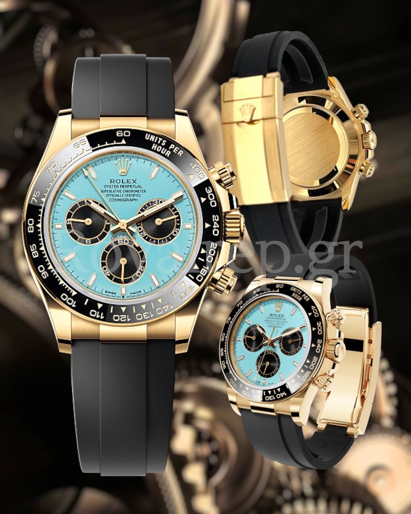 Το Rolex Daytona Cosmograph Gold Oysterflex Tiffany Dial 116515 είναι μια ξεχωριστή ρέπλικα που συνδυάζει τον διαχρονικό σχεδιασμό της σειράς Daytona με μια τολμηρή, μοντέρνα πινελιά: το καντράν σε απόχρωση Tiffany blue. Η κάσα είναι επιχρυσωμένη και κατασκευασμένη από ανοξείδωτο ατσάλι 904L, ενώ το μαύρο λουράκι Oysterflex από καουτσούκ προσφέρει άνεση και σπορ εμφάνιση. Ο αυτόματος μηχανισμός τύπου ETA και οι πλήρως λειτουργικοί υποκαντράνοι χρονογράφου ολοκληρώνουν ένα μοναδικό ρολόι που δεν περνά απαρατήρητο.