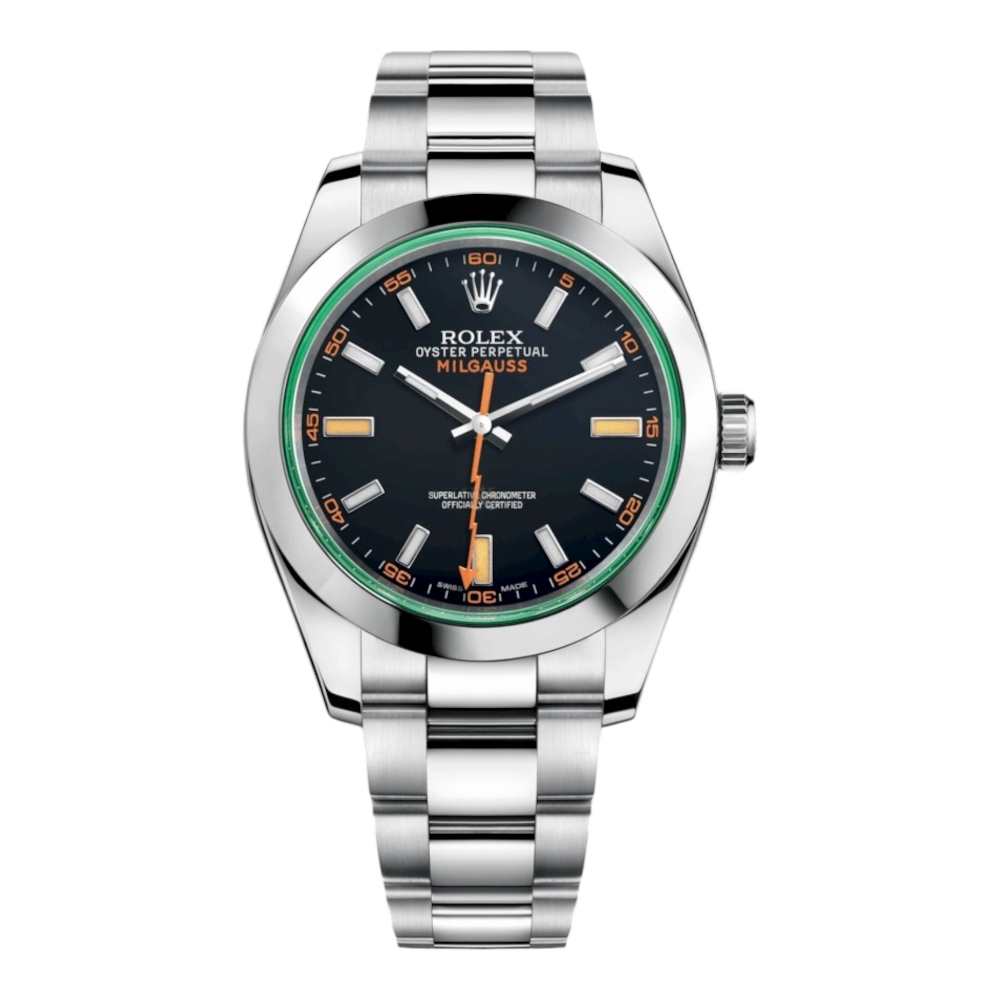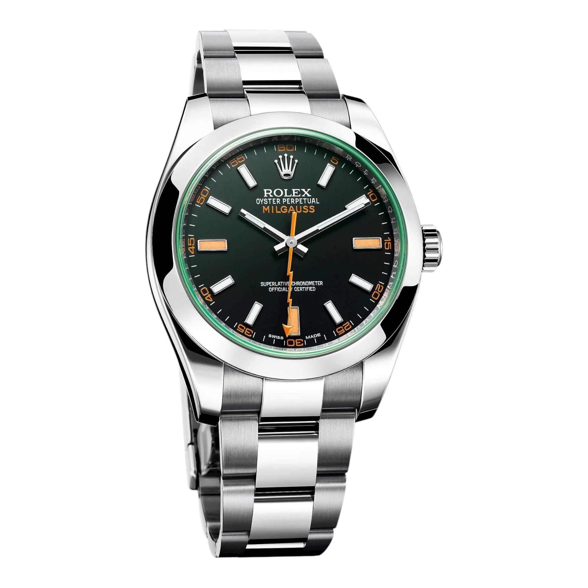 Το Rolex Milgauss είναι ένα μοναδικό και κομψό αντιμαγνητικό ρολόι, γνωστό για τον τολμηρό σχεδιασμό του, που διαθέτει έναν ξεχωριστό δείκτη δευτερολέπτων σε σχήμα αστραπής και ένα πολύχρωμο ή πράσινο κρύσταλλο ζαφειριού. Είναι ένα υψηλής ποιότητας, στιβαρό ρολόι εργαλείων με κάσα Oyster 40 mm και ένα αξιόπιστο μπρασελέ Oyster με επέκταση Easylink για άνεση. Ενώ η κύρια τεχνική του λειτουργία είναι η μαγνητική αντίσταση (έως 1.000 gauss) με ένα ειδικό εσωτερικό μαλακό σιδερένιο κλουβί, λειτουργεί επίσης ως ένα ρολόι υψηλής απόδοσης για καθημερινή χρήση.